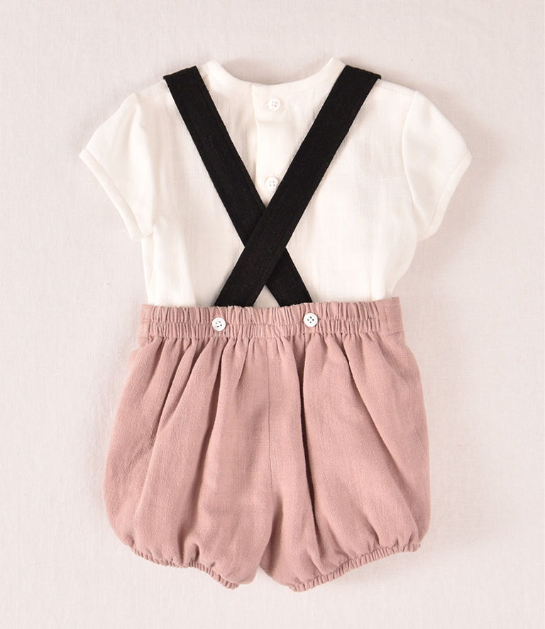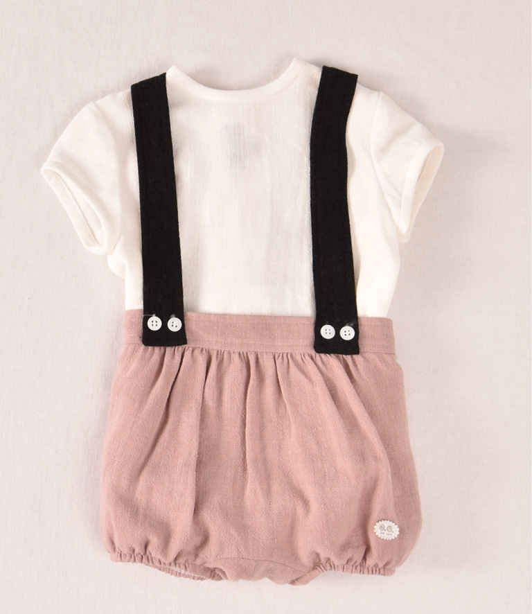 Conjunto de bebe de niño compuesto por camisa manga corta blanca y ranitq rosa empolvado con tirantes negros.